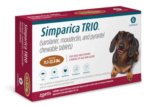 Simparica Trio kills the ticks and also protects your dog from hookworms, heartworms, and roundworms. Give your dog this tablet every month. It’s available for dogs from 3 pounds up to 130 pounds.